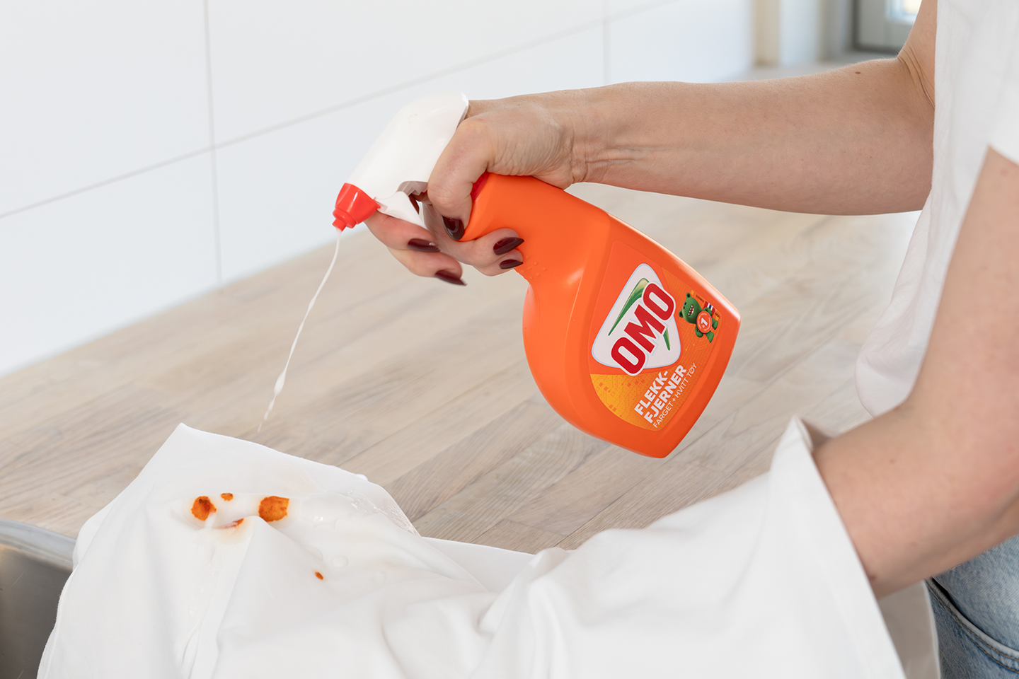 Spray flekkfjerneren direkte på flekken, gni det lett inn og la den virke i ca. 5 minutter før du vasker plagget på vanlig måte. OMO Flekkfjerner er effektiv fra 30 grader. Skal ikke brukes på Ull og Silke.