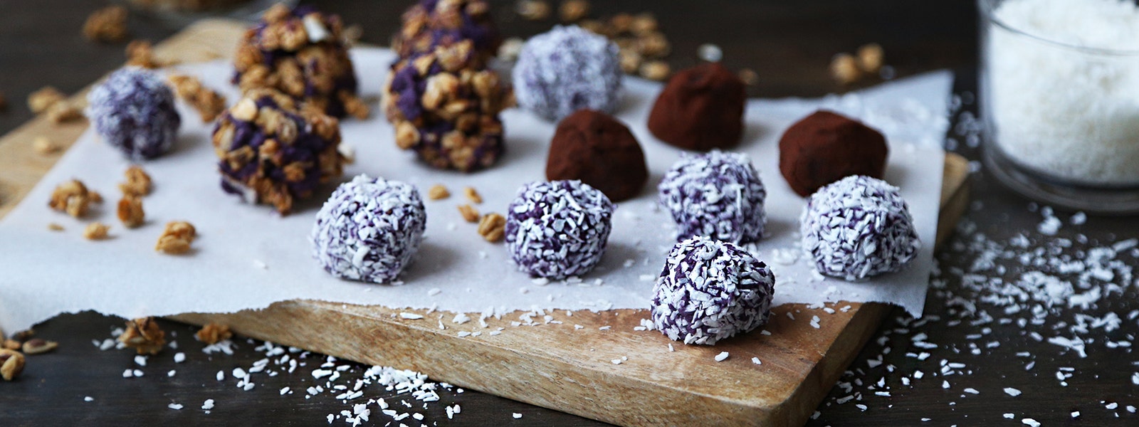 Skyll 100 g hvite kokte bønner. Kjør dem glatt i en foodprocessor sammen med 50 g Supergranola med hasselnøtt & kokos, 3 ss blåbærsyltetøy og ½ ts kardemomme. Form små kuler, ca .15-20 stk. Trill dem til slutt i granola, kokos eller mørk kakao. La de ligge litt i fryseboksen, deretter i kjøleskapet til de skal nytes. Supre å ha med på tur, de er perfekte å spise underveis når de små trenger litt energi.
