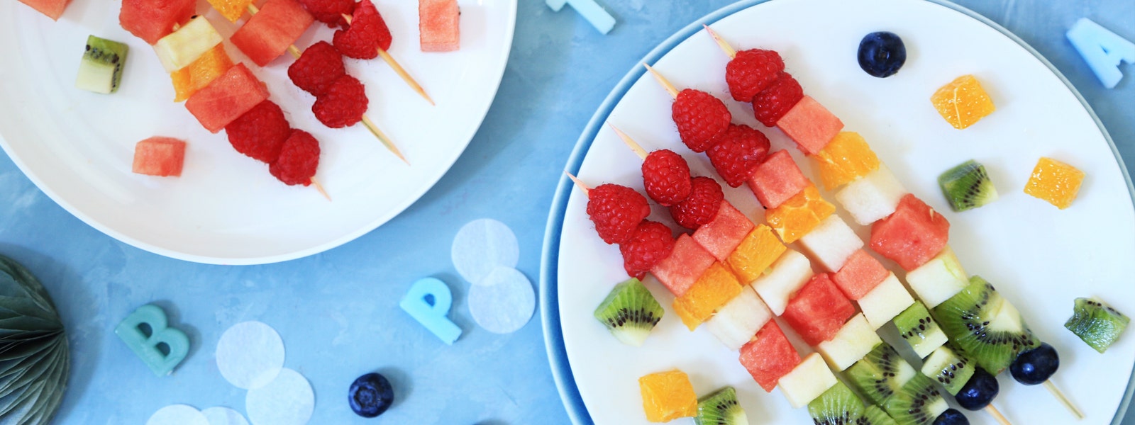 Sunnere enn godteri, men like gøy å spise! Disse fargerike fruktspydene kan du gjerne lage dagen før festen.