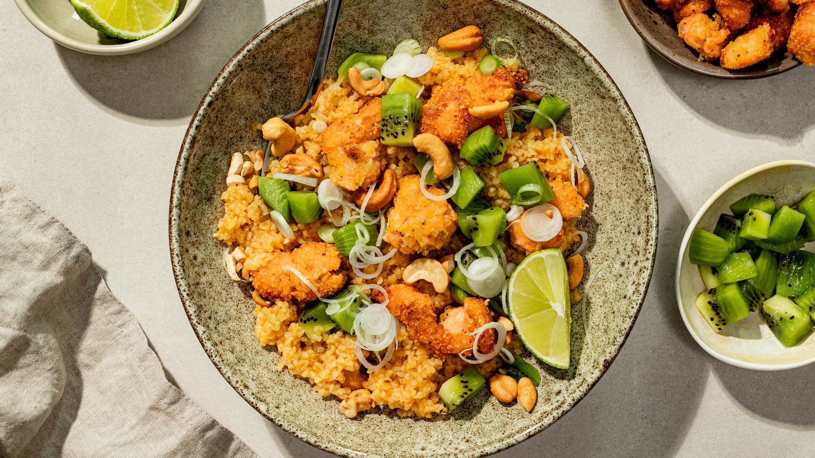 En poke bowl basert på bulgur og mangochutney, toppet med sprø salmalaks, kiwi, vårløk og cashewnøtter. Supergodt og mettende! Kiwi er mye mer enn bare en frukt. Den har fantastisk balanse i syre og sødme, og passer perfekt til alle typer stekt kjøtt og fisk. Utradisjonelt, men vi lover at det smaker fantastisk! Klikk på bildet for å se oppskriften.
