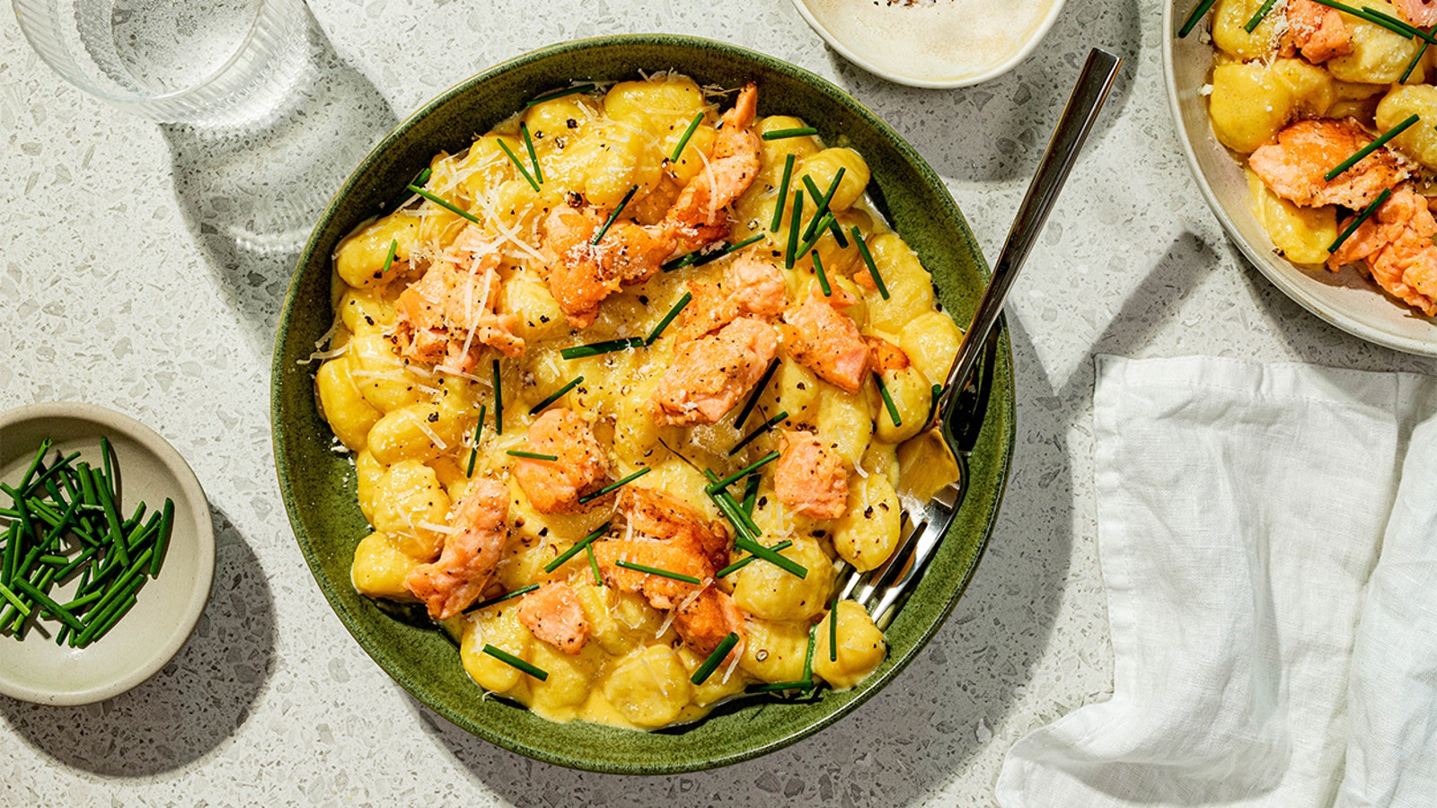 Carbonara er en storfavoritt hos mange. I denne varianten er båndpasta byttet ut med gnocchi og bacon med laks. Sammen gjør det retten raskere å lage og gir laksen en ny dimensjon! Klikk på bildet for å se oppskriften.