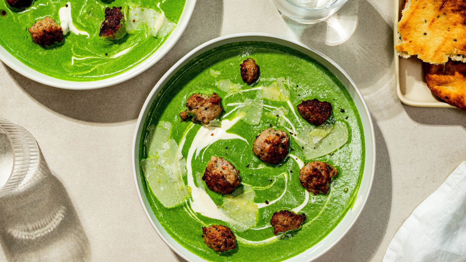 Spinat og parmesan gir masse god smak i denne grønne suppen. Potetstappe jevner og gir fylde. Toppet med smakfulle og superenkle kjøttboller blir den også mettende. Klikk på bildet for å se oppskriften.