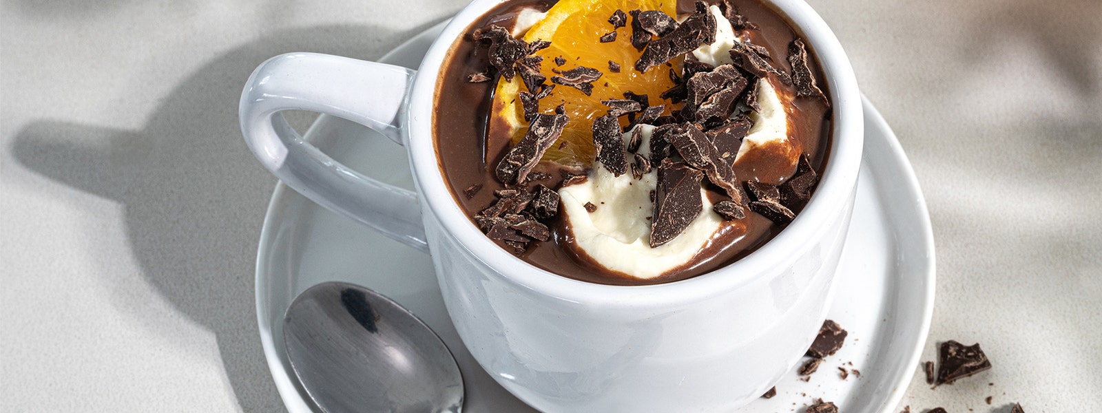 Denne kakaoen er laget med varm sjokolade og mandelmelk, og har en smak av appelsin. Du kan bruke din favorittsjokolade for å gjøre den til en personlig favoritt, og den kan også toppes med pisket krem, appelsinskiver og revet sjokolade. Se oppskrift her