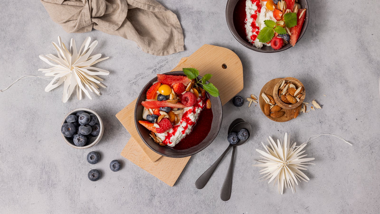 Prøv en litt sunnere julekos med Cottage Cheese Vanilje. Det blir ekstra godt dersom du topper med hjemmelaget bringebærsaus og frisk frukt og bær.